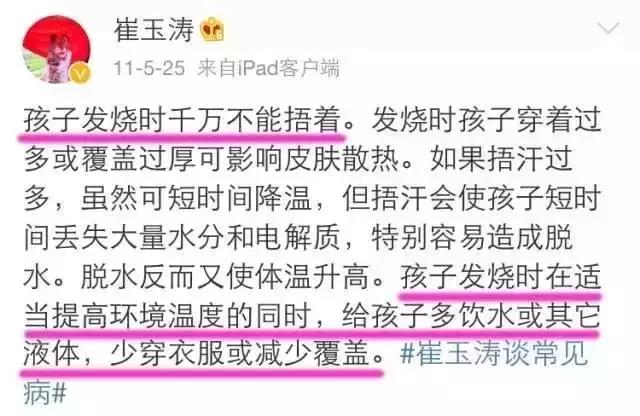(注意:进行这些降温处理时,如果孩子有手脚发凉、全身发抖、口唇发紫等所谓寒冷反应,要立即停止。必须先用退烧药物,降低设定温度,这时再辅助物理散热,体温才会真正降下来。)