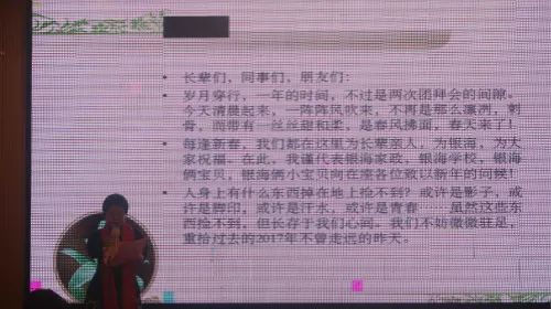 年会最重要,也是最振奋人心的环节依旧还是董事长致辞。银海家政董事长王朝晖女士用质朴的声音表达了新春美好的祝福,她带领大家共同回顾了银海家政2017这不平凡的一年。